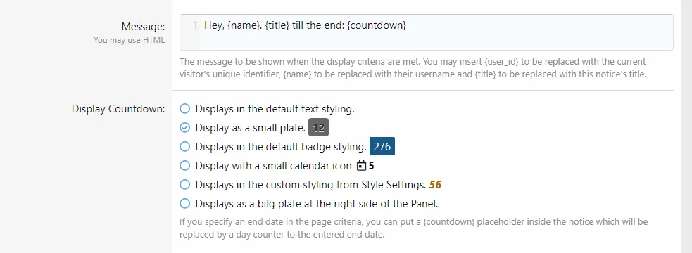 This AddOn allows you to add a day countdown till the selected end date in the page criteria in the notice. You can choose between some designs or create your own.